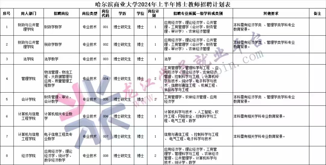 (八)各崗位的數(shù)量、專業(yè)及具體要求,詳見(jiàn)《哈爾濱商業(yè)大學(xué)2024年上半年博士教師招聘計(jì)劃表》(附件1)。