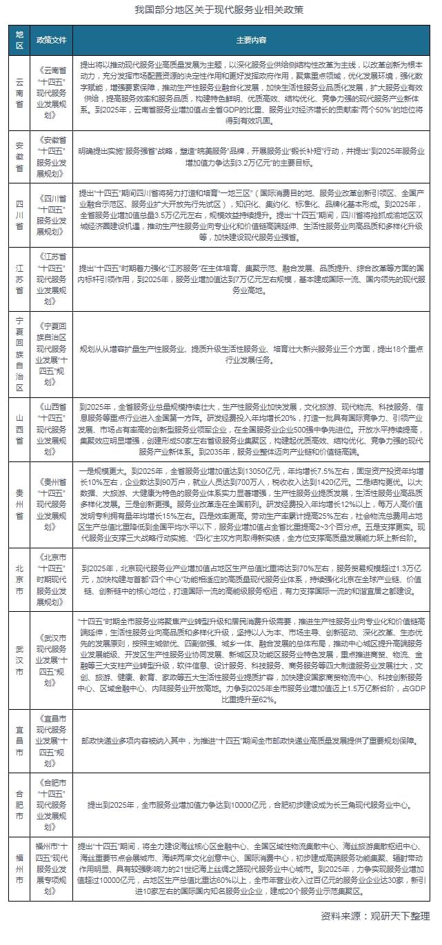 地方層面上,例如云南省發(fā)布的《云南省“十四五”現(xiàn)代服務(wù)業(yè)發(fā)展規(guī)劃》,提出將以推動(dòng)現(xiàn)代服務(wù)業(yè)高質(zhì)量發(fā)展為主題,以深化服務(wù)業(yè)供給側(cè)結(jié)構(gòu)性改革為主線,以改革創(chuàng)新為根本動(dòng)力,充分發(fā)揮市場(chǎng)配置資源的決定性作用和更好發(fā)揮政府作用,聚焦重點(diǎn)領(lǐng)域,優(yōu)化發(fā)展環(huán)境,強(qiáng)化數(shù)字賦能,增強(qiáng)要素保障,推動(dòng)生產(chǎn)性服務(wù)業(yè)融合化發(fā)展,加快生活性服務(wù)業(yè)品質(zhì)化發(fā)展,擴(kuò)大服務(wù)業(yè)有效供給,提高服務(wù)效率和服務(wù)品質(zhì),構(gòu)建特色鮮明、優(yōu)質(zhì)高效、結(jié)構(gòu)優(yōu)化、競(jìng)爭(zhēng)力強(qiáng)的現(xiàn)代服務(wù)產(chǎn)業(yè)新體系。到2025年,云南省服務(wù)業(yè)增加值占全省GDP的比重、服務(wù)業(yè)對(duì)經(jīng)濟(jì)增長(zhǎng)的貢獻(xiàn)率“兩個(gè)50%”的地位將得到有效鞏固。