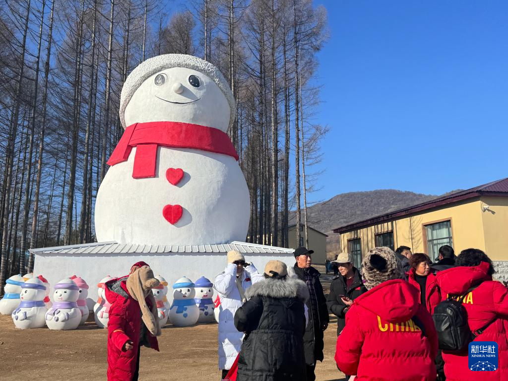 ??游客在哈雪谷旅游度假村的雪人造型前拍照(11月20日攝)。新華社記者 沈易瑾 攝